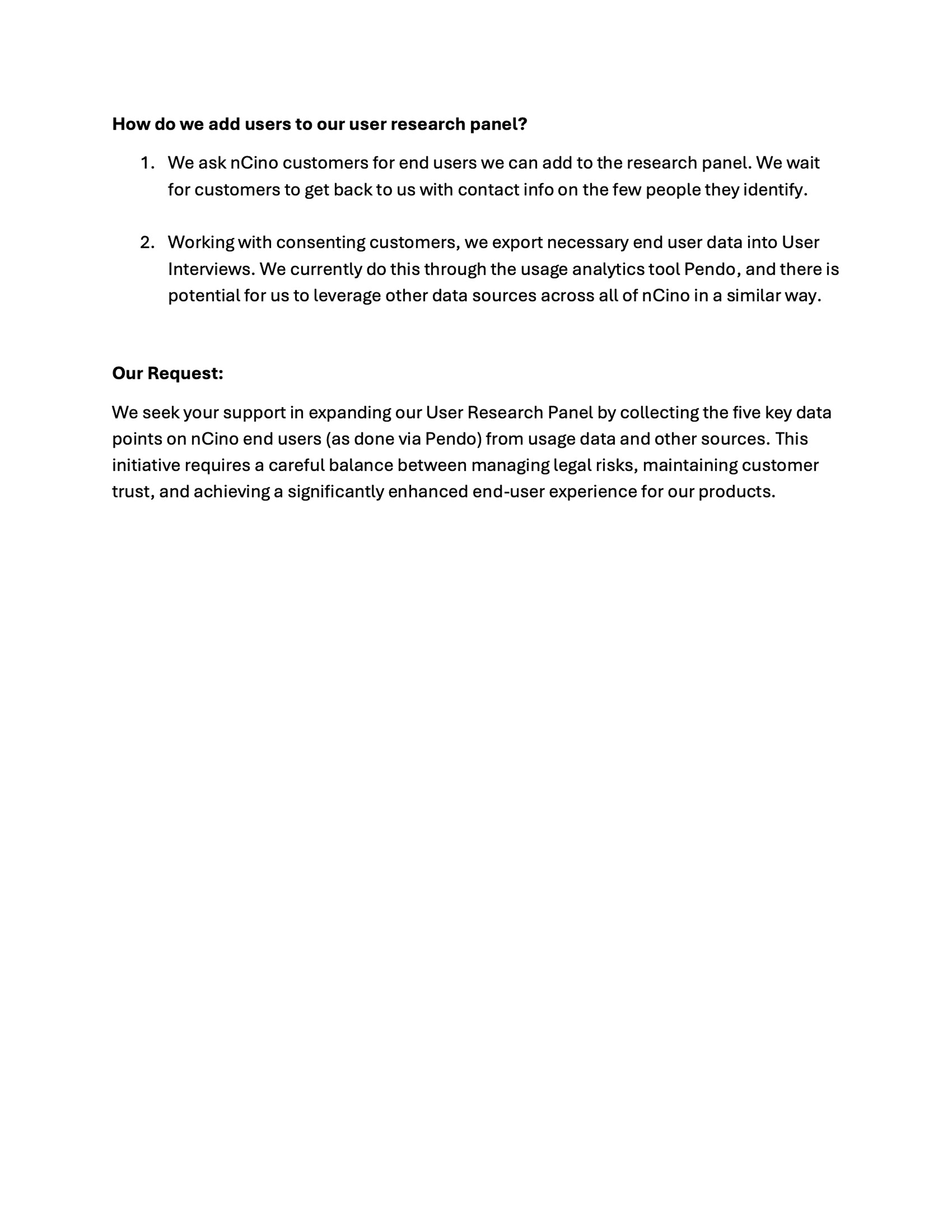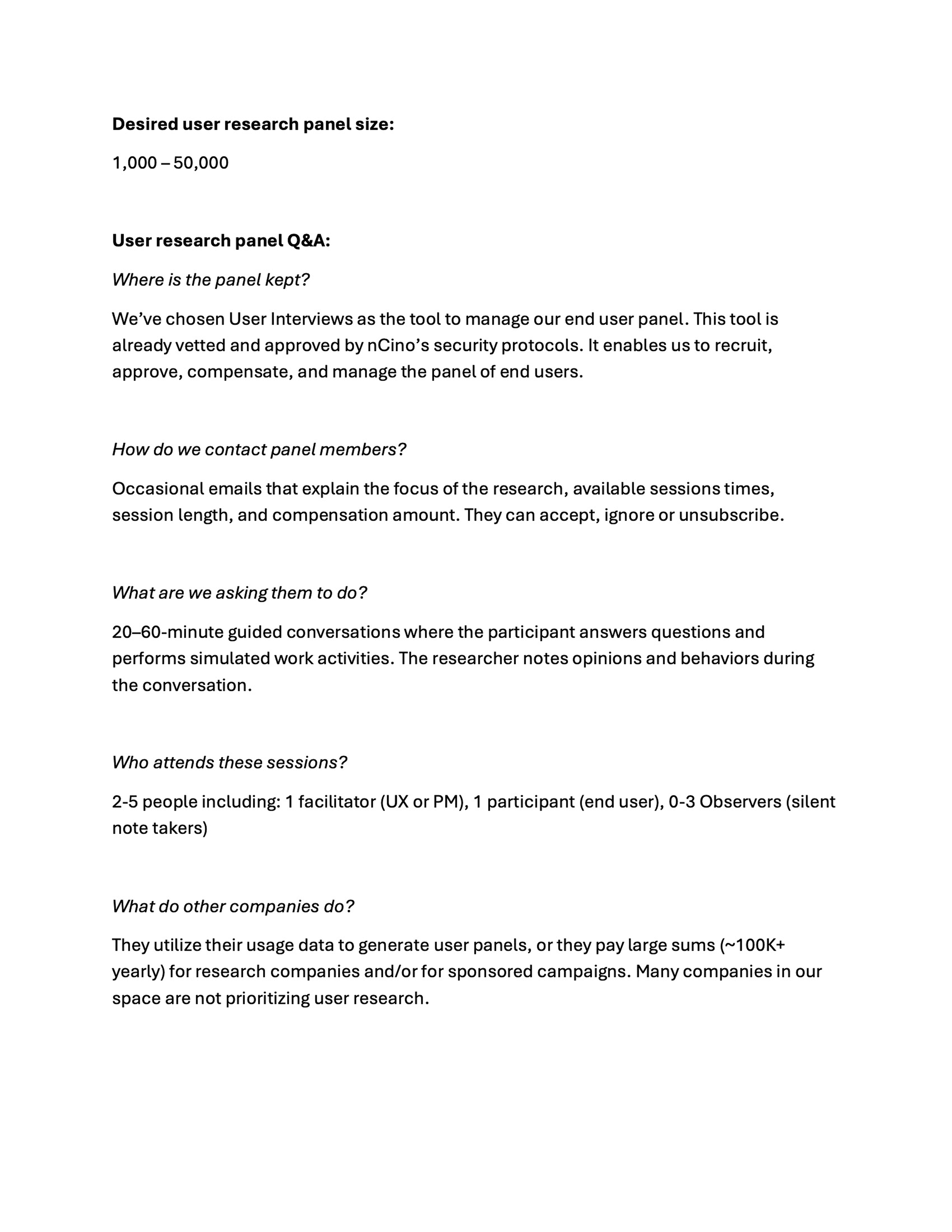 Our single largest challenge was finding the right users to research with. In B2B fintech, you can't just post on social media and expect to have qualified candidates show up. I spearheaded an effort to build nCino's first-ever user research panel, collaborating across nearly every department: Legal, Customer Success, Product, Sales, Security, and Engineering.