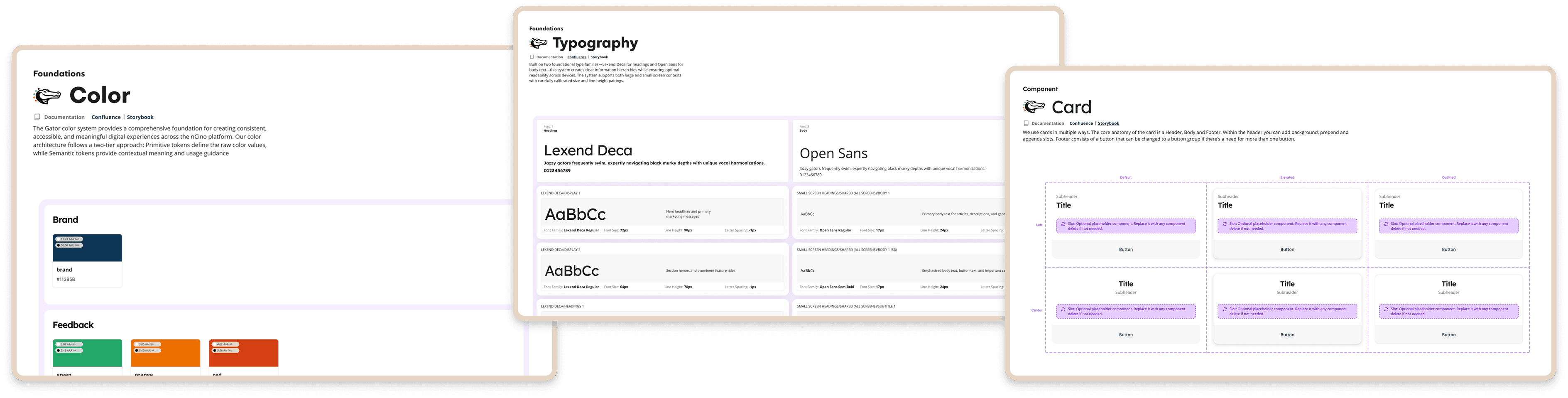 One of the most significant transformations was enabling Gator, nCino's enterprise design system. I partnered with engineering leadership to audit existing components, identify overlaps, and integrate global standards into PA's products. Designers standardized naming and usage while engineers improved accessibility and logic. It was the first time a shared component library had been introduced to the business unit. While challenging, it dramatically improved workflows over time.