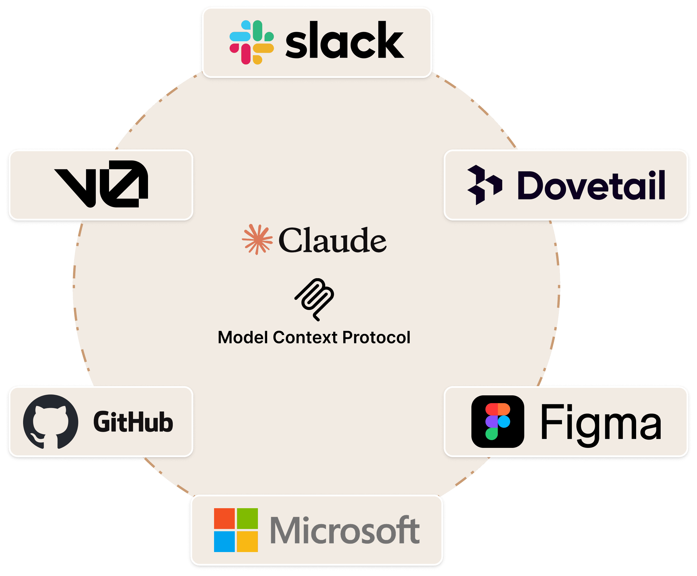 Claude MCP integrations for automated Dovetail synthesis, GitHub component documentation, v0 context engineering, Microsoft Onedrive integration and Figma Dev Mode clarity