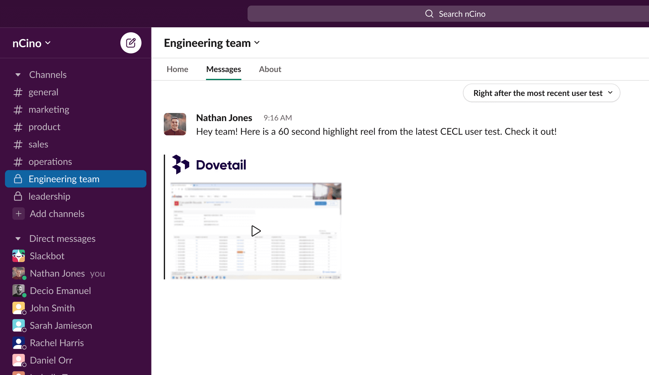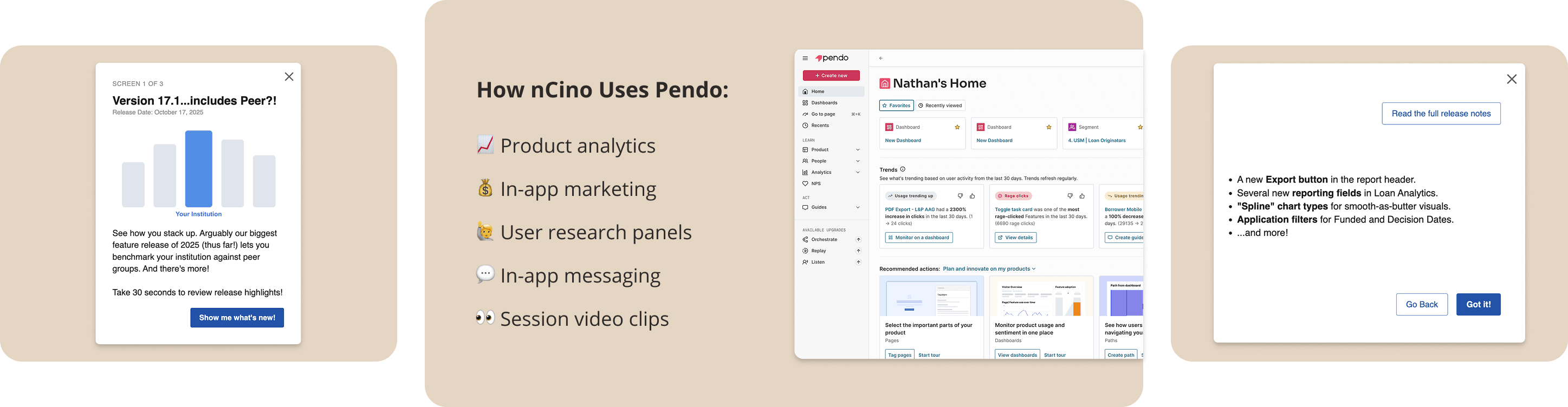 Before I arrived, no one at nCino Analytics had conducted true user research. I created templates, tagging systems, and analysis workflows in Dovetail, then collaborated with product and customer success partners to recruit representative users across institutions.